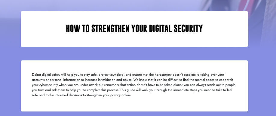 Improving digital safety is important for survivors of online harassment to prevent the harassment from leading to account hijacking or otherwise finding personal information that may endanger survivors. For survivors who are overwhelmed at the idea of coping with their cybersecurity, advocates can assist survivors with walking through this guide, taking immediate steps to strengthen their privacy.